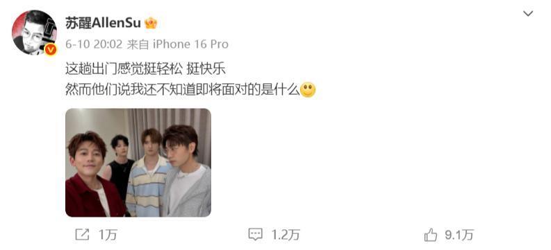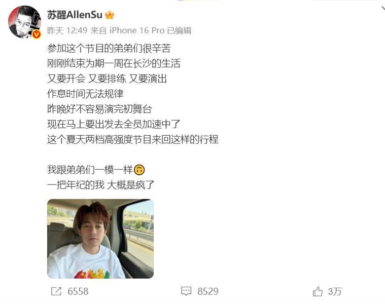 我们可以发现,苏醒刚出发赶往录制地点前,他发出一条消息:这趟出门感觉挺轻松,挺快乐,然而他们说,我还不知道将面对什么,当初舞台录制结束后,苏醒又发一条消息,而他肉眼可见地憔悴,表示:参加这个节目的弟弟们很辛苦,刚结束为期一周的长沙生活,又要开会,又要排练,又要演出。