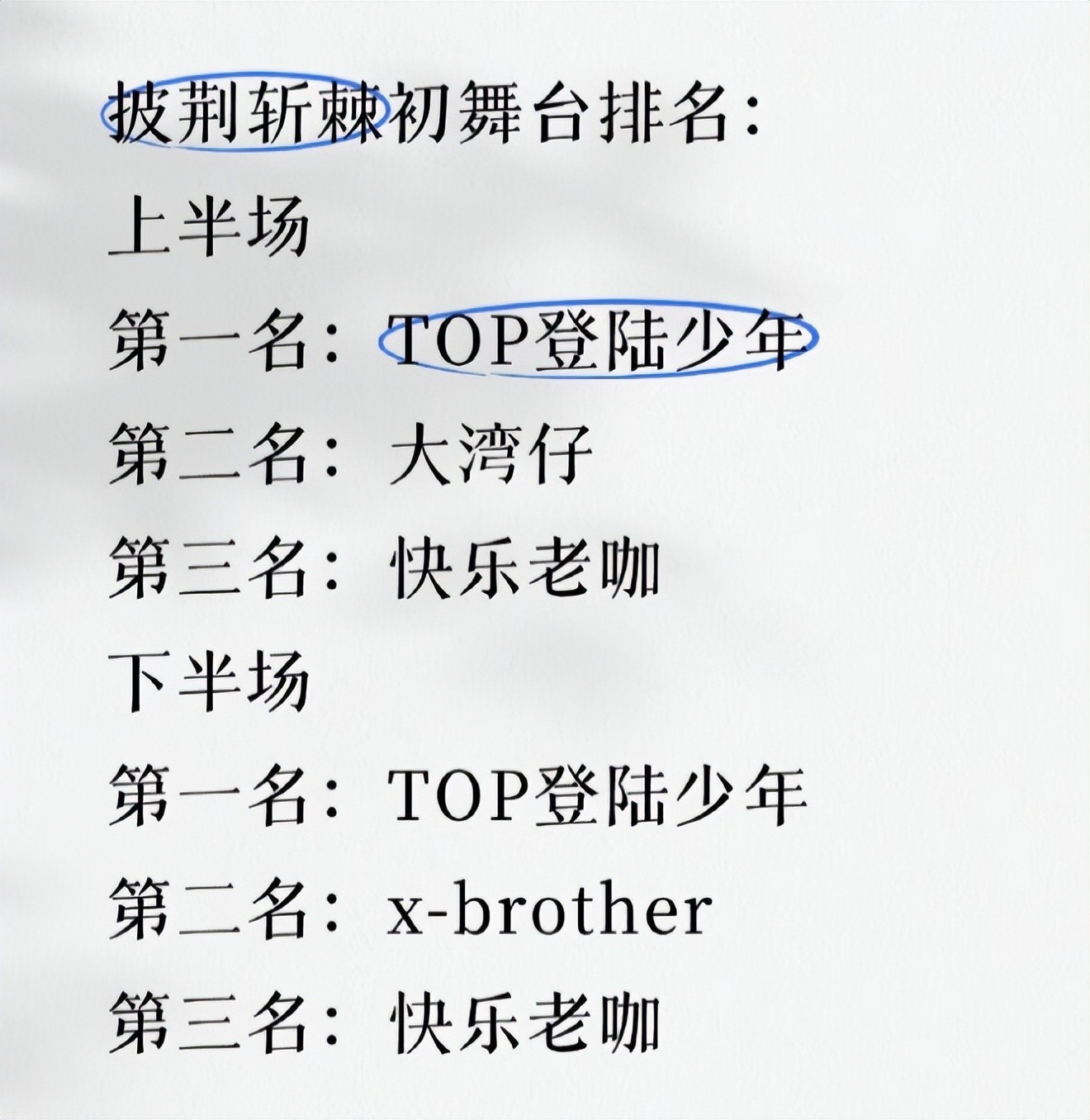 当《披荆斩棘5》初舞台录制完成,网上传出排名消息,在初舞台时,每个男团会选择两首歌曲,比拼分为上半场和下半场,从传出的消息上看,上半场排名前三的团是:TOP登陆少年、大湾仔、快乐老咖,下半场前三名的团是:TOP登陆少年、X-brother、快乐老咖。