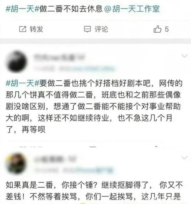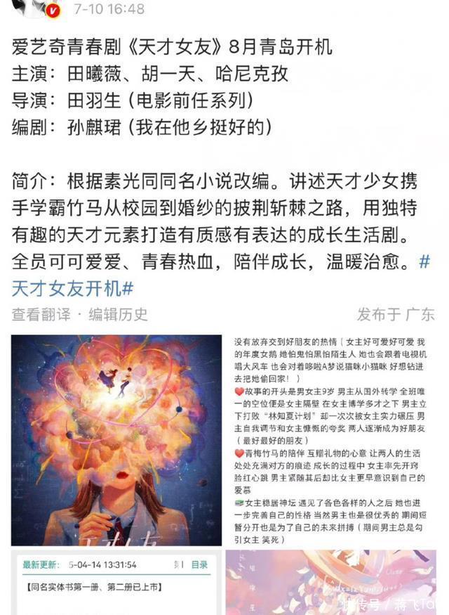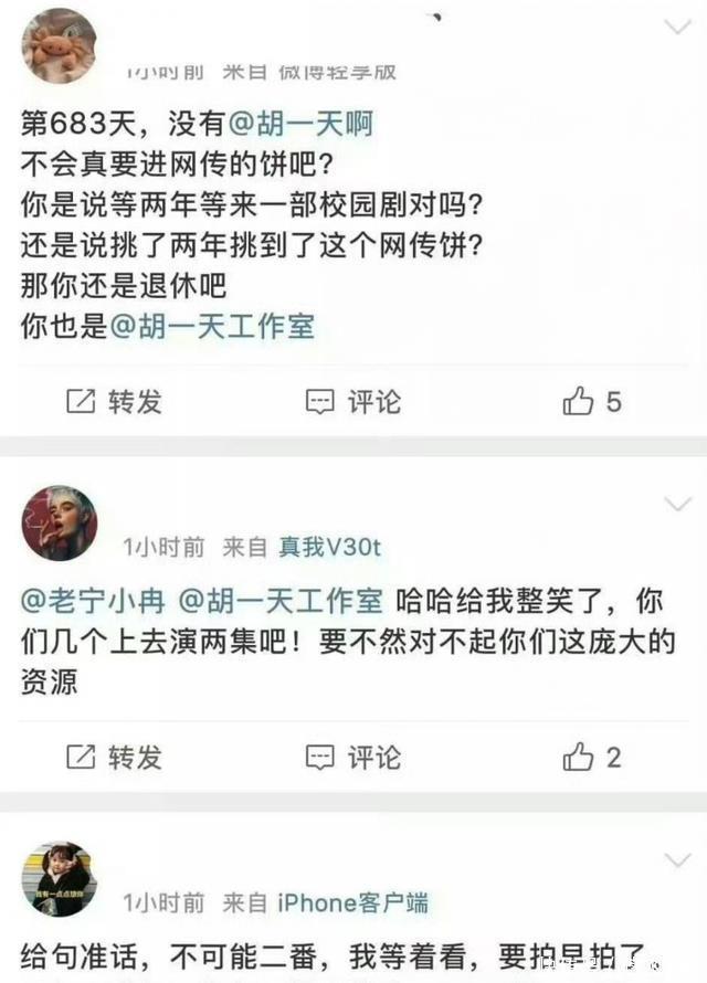7月11日,有消息称胡一天马上要进组了,要和田曦薇搭档出演青春校园剧《天才女友》,从剧名来看,显然女主是一番,对此胡一天粉丝十分不乐意,觉得胡一天不至于给田曦薇当二番,粉丝等了600多天结果就接了个这样的剧本?还不如不接,30多了还演校园剧肯定会被嘲讽。